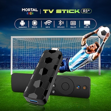 r3+ chiavetta TV Android 16.0, lettore multimediale in streaming 8K Ultra HD con chip RK3518, Wi-Fi 6, Bluetooth 5.4, HDR 10+, design con motivo calcistico, dongle smart TV portatile per feste di visione sportiva e appassionati di calcio