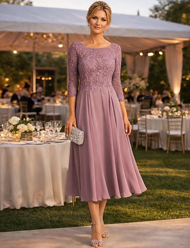 Linea ad A Lunghezza Tè Vestito da Festa Abito da Cocktail Abito da invitata a nozze Abito da cerimonia per signora Manica 3/4 Girocollo Elegante Ospite di nozze Festa di fidanzamento Chiffon Pizzo