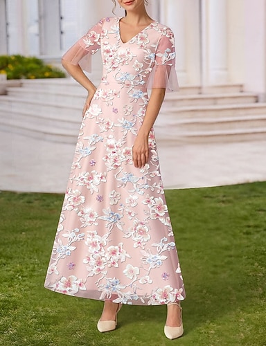 Linea ad A Abito Lunghezza alla caviglia Vestito da Festa Abito da Cocktail Abito da invitata a nozze Abito da cerimonia per signora Manica Corta Scollo a V Elegante Vintage Formale Tulle con Ricamo