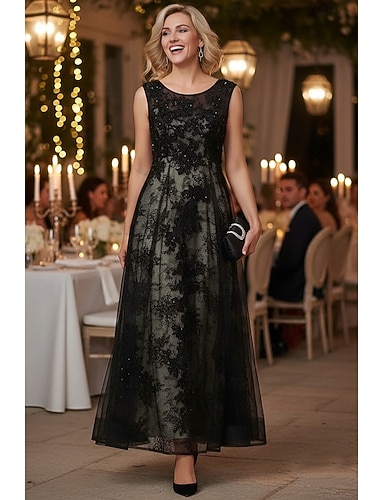 Linea ad A Lunghezza alla caviglia Vestito da Festa Abito da Cocktail Abito da invitata a nozze Abito da cerimonia per signora Senza Maniche Girocollo Elegante Vintage Abito Nero Formale Pizzo Tulle