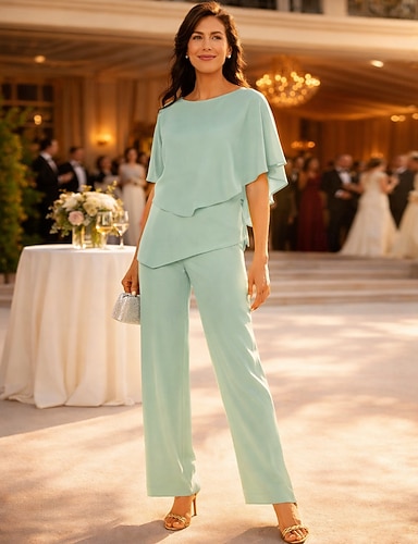 Due Pezzi Tuta Completo Pantalone Lunghezza al pavimento Abito da cerimonia per signora Mezza Manica Scollo a Barca Elegante Petite Ospite di nozze Chiesa Chiffon con Applicazioni