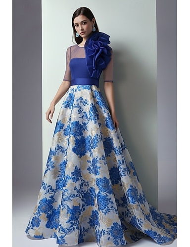 Linea ad A Lunghezza al pavimento Abito da Sera Elegante Floreale Setoso Mezza Manica Scollo Illusione Matrimonio Formale Tasca Raso Tulle Shiena scoperta con Stampa floreale Fiore ricamato
