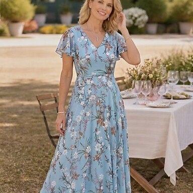 Due Pezzi Set di Abiti Lunghezza Tè Abito da invitata a nozze Abito da cerimonia per signora Manica Lunga Girocollo Elegante Vintage Cocktail Formale Chiffon con Stampa