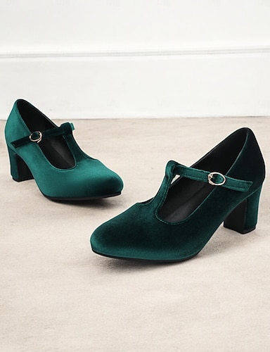 décolleté Mary Jane in velluto verde da donna con fibbia rotonda – tacchi medi in stile vintage anni '20 per feste, matrimoni e abiti retrò