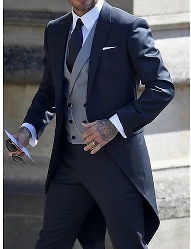 Uomo Smoking matrimonio invernale Palcoscenico Blu scuro Primavera, Autunno, Inverno, Estate Tuta Bavero classico Festa Retrò Vintage Tinta unita Vestibilità aderente 3 pezzi Monopetto a un bottone