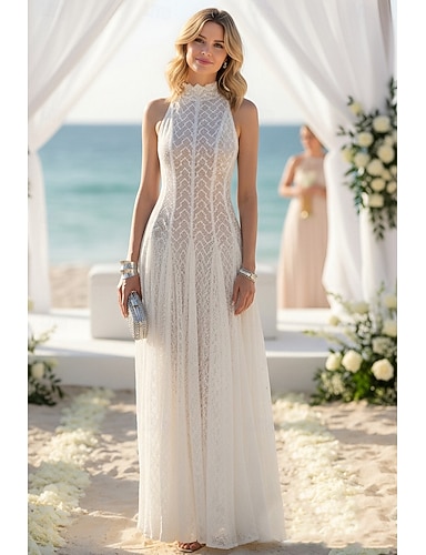 Linea ad A Lunghezza al pavimento Abito Bianco Abiti da sposa Abito da sposa Piccoli Abiti Bianchi Senza Maniche Collo Alto Laurea Compleanno con Pieghe Tinta unita
