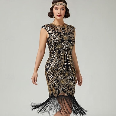 Anni Ruggenti Anni 1920 Lunghezza al ginocchio Abito Flapper Il grande Gatsby Paillettes Frange Tubino Colonna Scollo Tondo Costume Per donna Natale Carnevale Mascherata Festa a tema retrò Danza