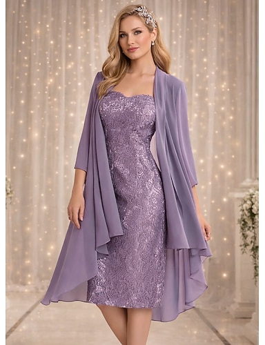 Due Pezzi Tubino Colonna Lunghezza al ginocchio Abito da invitata a nozze Abito da cerimonia per signora Manica 3/4 Scollo a Cuore Elegante Taglie Forti Ospite di nozze Chiesa Chiffon Pizzo Con Stola