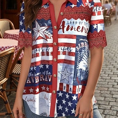 Giorno dell'Indipendenza americana T-shirt da donna bottoni stampa grafica anniversario dell'America vintage elegante moderna a manica lunga colletto regolari top quotidiani blu nero rosso rosso blu