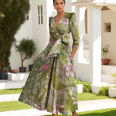 Linea ad A Lunghezza Tè Vestito da Festa Abito da Cocktail Abito da invitata a nozze Abito da Sera Elegante Vintage Manica 3/4 Colletto a Camicia Matrimonio Formale Jacquard con Tasca