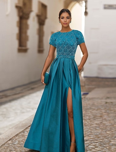 Linea ad A Lunghezza al pavimento Abito da Sera Da principessa Abito formale Elegante Vintage Scintillante Manica Corta Collo gioiello Formale Tasca Raso con Strass Glitter Spacco