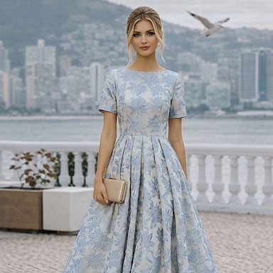 Linea ad A Lunghezza alla caviglia Abito Formale Abiti da Cocktail Elegante Floreale Manica Corta Scollo a V Festa in giardino Matrimonio Tasca Jacquard con Pieghe