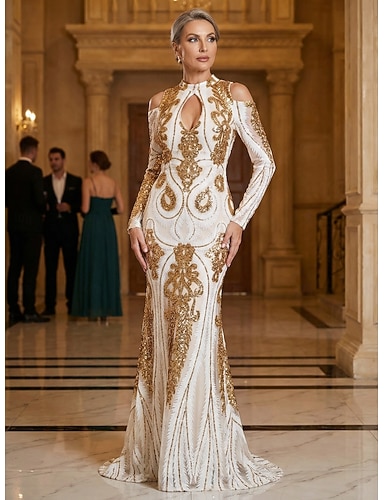 Abito da sera A-Line Abito elegante Ospite di matrimonio Ballo Lunghezza intera Maniche lunghe Queen Anne Paillettes con cintura nastro Paillettes