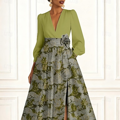 Abito da sera A-Line in jacquard floreale elegante formale lungo fino al pavimento con maniche a 3/4 scollo a V in nylon con fiocco/i e spacco