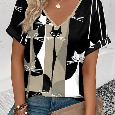 T shirt da donna a maniche lunghe con scollatura a girocollo tunica lunga casual ombre stampa gatto top regolari quotidiani neri primavera autunno precaldo