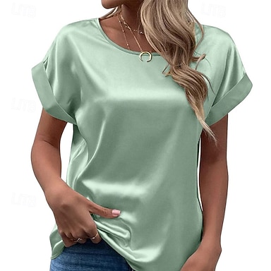 Per donna Elegant Top in raso Maglietta A calotta di seta Semplice Moda Moderno Manica Corta Girocollo Top Regolari Quotidiano Uscire Weekend Verde chiaro Verde scuro Viola Grigio chiaro Estate