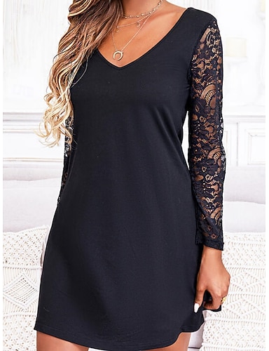 Per donna Abito al ginocchio Abito Midi Abito in Pizzo Abito nero Vestito Casual Elegante Moda Moderno All'aperto Vacanza Uscire Vestibilità regolare Semplice Manica Lunga Girocollo Scollo a V Nero