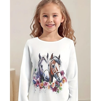 Ragazze 3D Animale Cavallo Maglietta Manica Lunga Primavera Autunno Moda Essenziale Bambini 4-12 Anni Girocollo All'aperto Casuale Quotidiano Vestibilità regolare