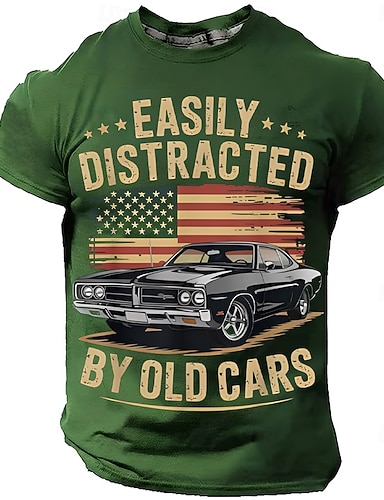 Festa del papà, facilmente distratto dalle vecchie auto, regalo per ragazzi amanti delle auto, classica muscle car, vintage, bandiera degli Stati Uniti, maglietta verde da uomo, abbigliamento,