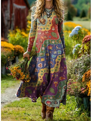 Abito Midi Donna Boho Abito A-Line Abito Fit And Flare Vacanza Casual Giornaliero Stile Regolare Grafico Geometrico Manica Lunga Collo Tondo Blu Rosa Viola Arancione Estate Primavera