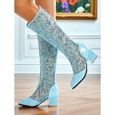 stivali da donna a metà polpaccio con pizzo blu e tacco a blocco - eleganti stivali vintage retrò in rete per matrimoni, feste &costumi cosplay