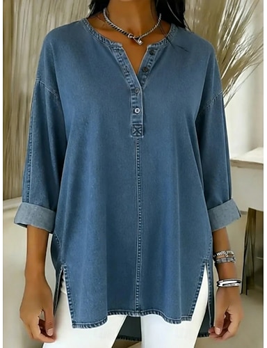 Per donna Camicia popover Camicia casual Blusa Bottoni Tinta unica Vacanza Vintage Elegante Manica Lunga Girocollo Top Regolari Quotidiano All'aperto Ferie Blu Primavera Autunno Inverno