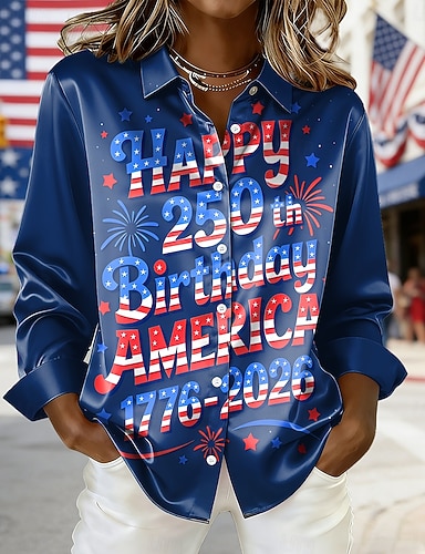 Camicia da donna in raso per il 250° anniversario dell'indipendenza americana, stampa bandiera americana, moda vintage, manica lunga, colletto, top normali, per tutti i giorni, per le vacanze, per
