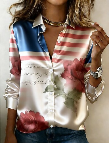 Giorno dell'Indipendenza Americana Per donna Camicia Camicia in raso Camicia button-down Camicia casual Stampato Floreale Grafico Bandiera Elegante Essenziale Classico Manica Lunga Colletto a Camicia
