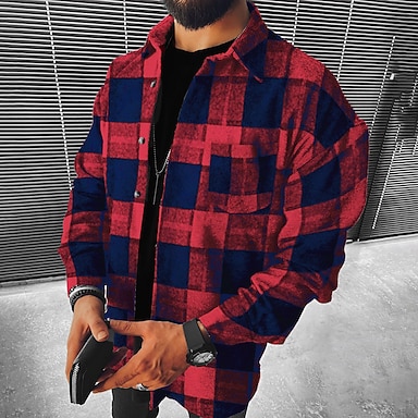 Per uomo Giacca-camicia Giacca camicia Giacca invernale Plaid Vacanza Abbigliamento quotidiano Bianco Rosso Blu marino Azzurro cielo Manica Lunga Bavero Autunno Inverno Abbigliamento Tasca Frontale