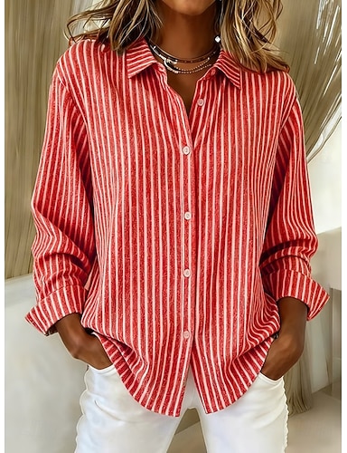 Per donna Blusa Camicia in finto lino Bottoni Stampato A righe Elegante Casual Manica Lunga Colletto a Camicia Top Regolari Quotidiano Nero Rosso Marrone Estate Primavera Autunno