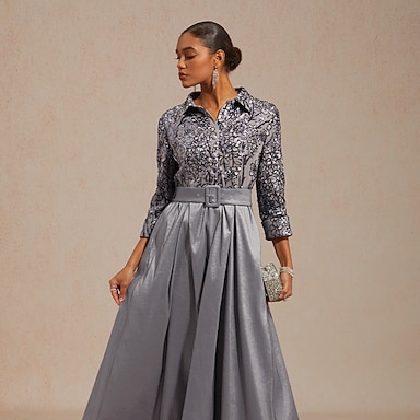 Linea ad A Lunghezza al pavimento Abito da invitata a nozze Abito Formale Abito svasato Abito da cerimonia per signora Manica Lunga Colletto a Camicia Elegante Formale Ospite di nozze Raso con