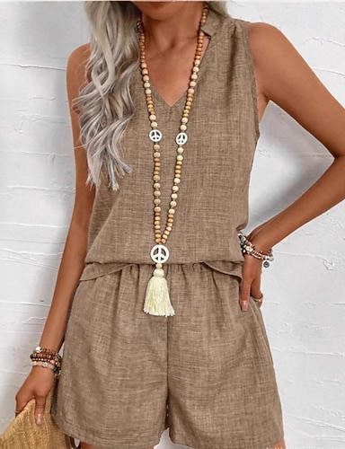 Per donna Set da due pezzi Blusa Set di Pantaloncini Senza Maniche Scollo a V Tinta unica Arricciato Streetwear Quotidiano Ferie Blu Cachi Estate Vestibilità regolare