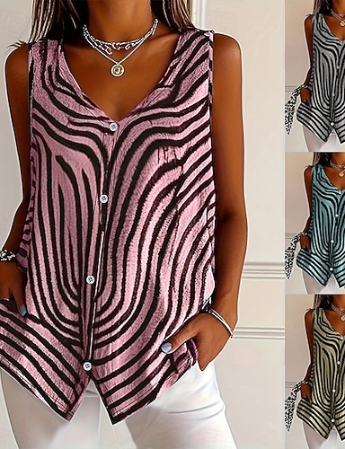 Per donna Canotta Finto cotone e lino Bottoni A righe Elegante Casual Senza Maniche Scollo a V Top lunghi Quotidiano Blu Nero Giallo Rosso Estate Primavera