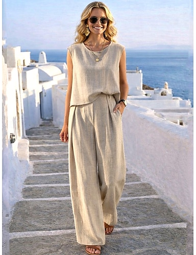 Per donna Set di Pantaloni Bolero Top Finto cotone e lino Senza Maniche Girocollo Tinta unica Moda Streetwear Casuale Quotidiano All'aperto Nero Blu marino Cachi Estate Vestibilità comoda