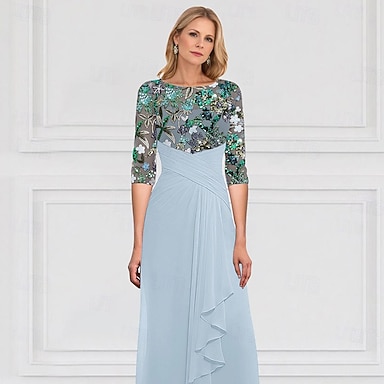 Due Pezzi Set di Abiti Lunghezza alla caviglia Abito da invitata a nozze Abito da cerimonia per signora Manica Lunga Girocollo Elegante Ospite di nozze Chiesa Chiffon con Pizzo Ricamo