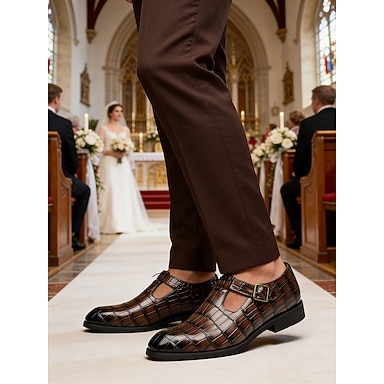 scarpe eleganti da uomo in similpelle marrone con cinturino alla caviglia, tomaia in coccodrillo goffrato, finitura lucida, stile classico ed elegante per sposi, invitati a nozze e cerimonie formali