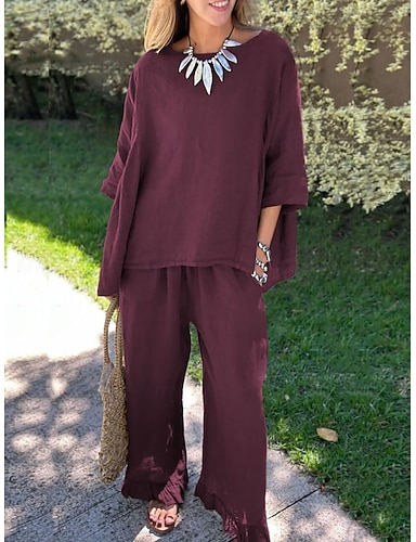 Per donna Set di Pantaloni Finto cotone e lino Manica 3/4 Girocollo Tinta unica Elegante Moda Streetwear Casuale Quotidiano All'aperto Nero Bianco Giallo Estate Vestibilità comoda