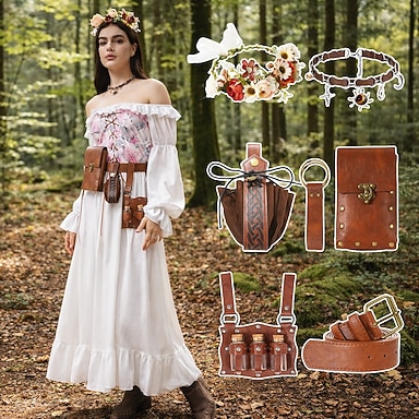 Medievale Rinascimento Vestito Copricapo Cintura in Vita Elfo Fata Elfico Costume Per donna Fantasia Halloween Carnevale Performance LARP Fiera Rinascimentale Adulti Vestito Cintura Altri Accessori