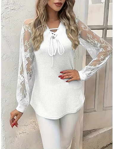 Per donna Top con cuciture in pizzo Top a maglia waffle Nodo frontale Pizzo Rete Tinta unica Elegante Manica Lunga Scollo a V Top lunghi Quotidiano Uscire Bianco Primavera Autunno Inverno
