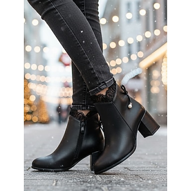 stivaletti da donna in similpelle nera con ciondolo di perle e tacco a blocco: eleganti stivaletti invernali corti da donna, perfetti per l'ufficio, lo streetwear e gli outfit quotidiani