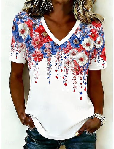 Maglietta patriottica per donne del Giorno dell'Indipendenza Stampa grafica Bandiera Piante Vintage Elegante Classico Manica corta V scollo Normale Tops Giornaliero Giallo Rosa Rosso Arancio Estate