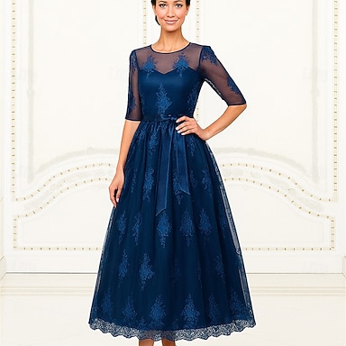 Abito da festa A-Line fino al tè Abito da cocktail Abito da ospite per matrimoni Abito per la madre della sposa con maniche a metà e collo rotondo elegante vintage con pieghe e ricami