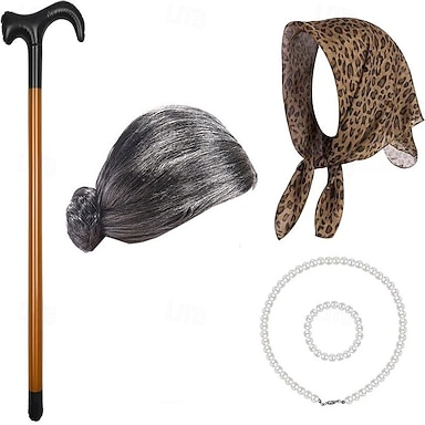 Kit di accessori per costumi da vecchia signora: parrucca nera con chignon, foulard leopardato, set di braccialetti con collana di perle, bastone da passeggio, perfetto per 100 giorni di scuola