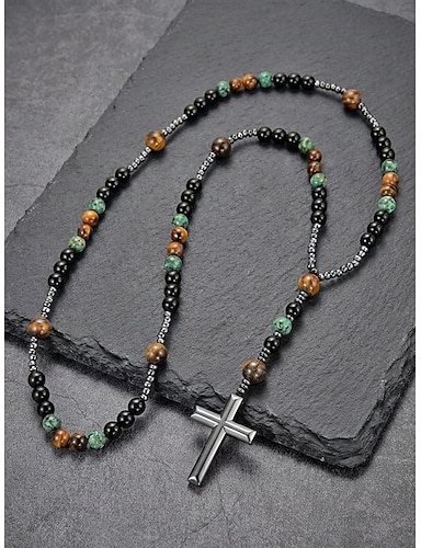 Collana lunga da uomo in stile bohémien con pietre naturali e ciondolo a croce con perline multicolore, ideale per viaggi, abbigliamento casual quotidiano, stile resort e look a strati di grande