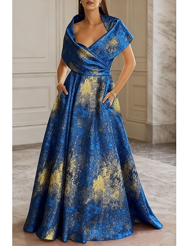 Abito da sera A-Line blu jacquard broccato elegante formale lungo fino al pavimento con maniche corte tasca Queen Anne in nylon con tasca