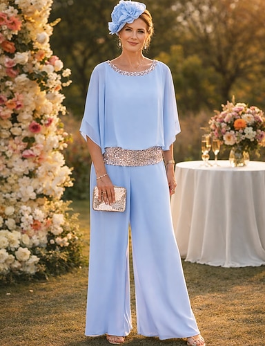 Tuta Completo Pantalone Tre Pezzi Completo Pantalone Lunghezza alla caviglia Abito da cerimonia per signora Mezza Manica Scollo a Barca Elegante Vintage Semplice Formale Ospite di nozze Chiffon