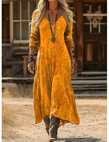 Per donna Abito lungo maxi Abito Boho Abito Vintage Vestito Casual Vintage Quotidiano All'aperto Vacanza Vestibilità regolare Floreale Manica Lunga Scollo a V Arancione Primavera Autunno