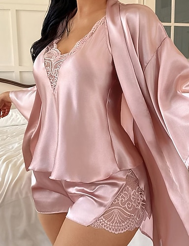Per donna Pigiama Accappatoio Camicia da Notte Casual Morbido Raso Colore Puro Pizzo Patchwork Casa Da letto Mezza Manica Scollo a V Argento Giallo Rosa Vino Estate Vestibilità comoda
