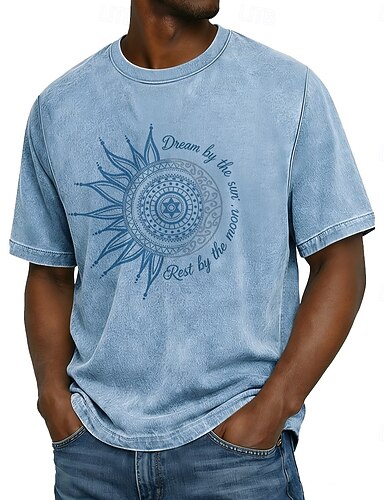 T-shirt da uomo "dream by the sun rest by the moon" con mandala sole e luna, stile boho celeste, lavaggio acido, stile streetwear vintage, grafica, manica corta, girocollo, casual, abbigliamento