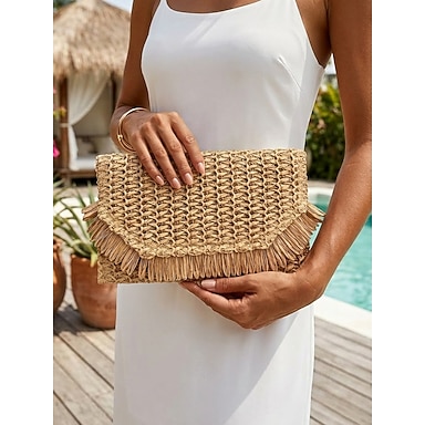 Pochette da donna in paglia stile bohémien, borsetta multicolore con decorazione a nappina, borsa leggera ed elegante per vacanze al mare, feste in spiaggia e uso quotidiano casual.